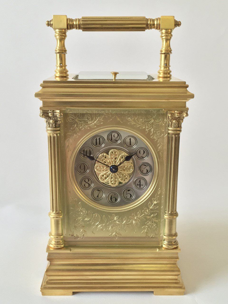 Nice large gilt cased French corinthian columned carriage clock with engraved gilt masked dial and silver recessed arabic numeral chapter ring. Movement fully restored with original platform lever escapement.