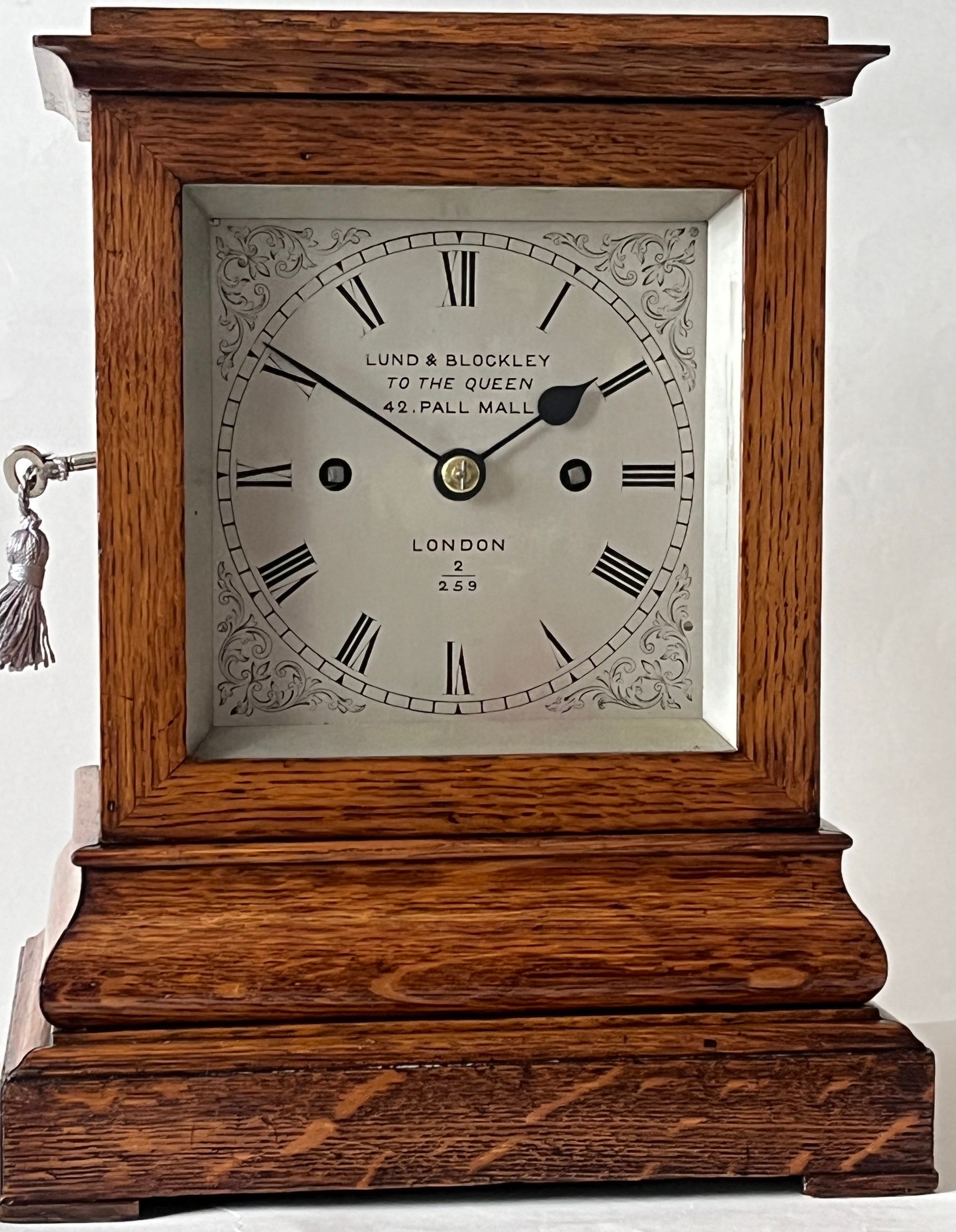 Nice oak cased striking fusee clock by Lund & Blockley Clockmakers to the Queen.