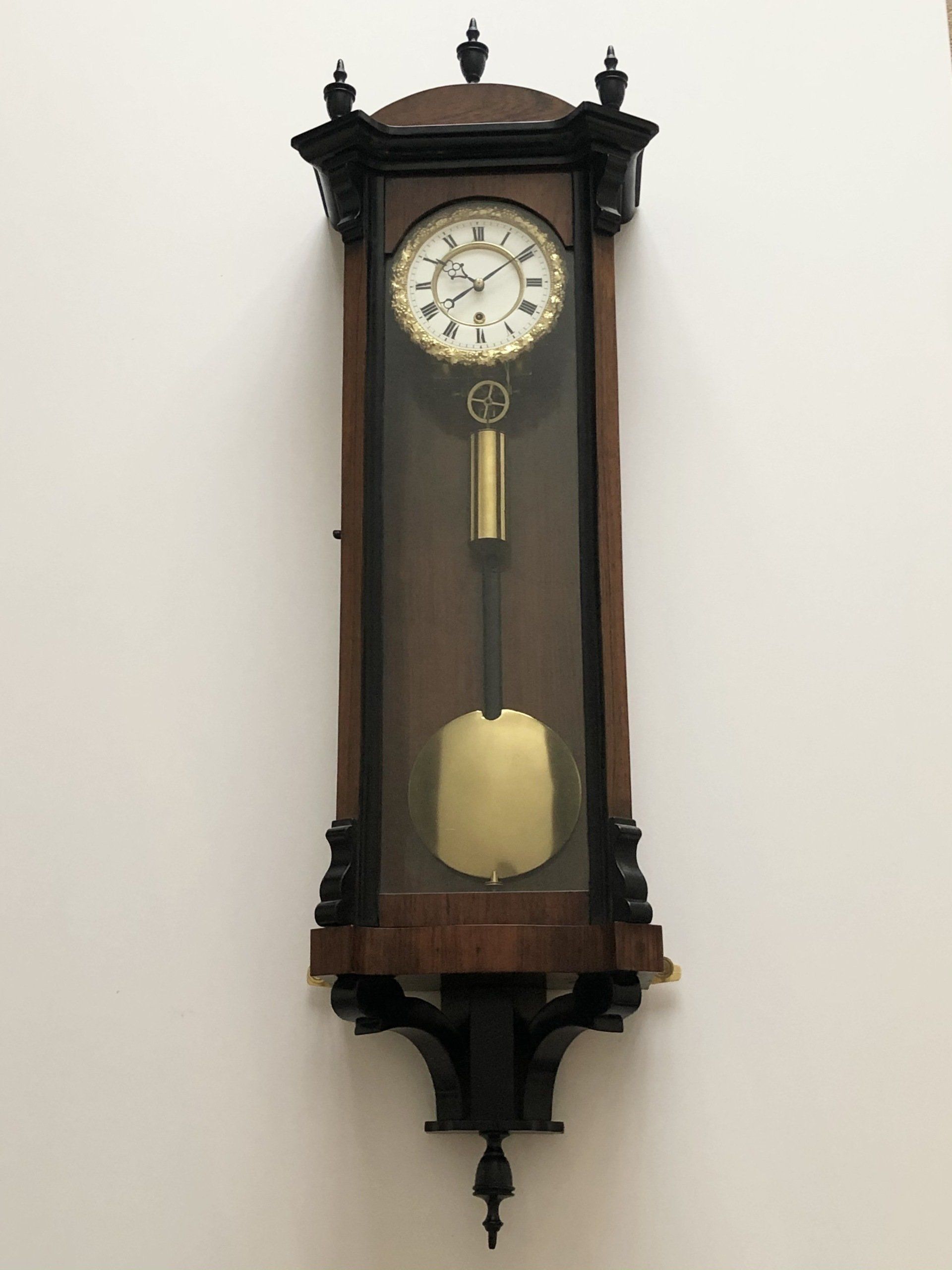 Rare miniature Beidermeier rosewood cased wall clock with a 100mm diameter pie crust dial bezel. Clock runs a full week on a winding and has been fully serviced.