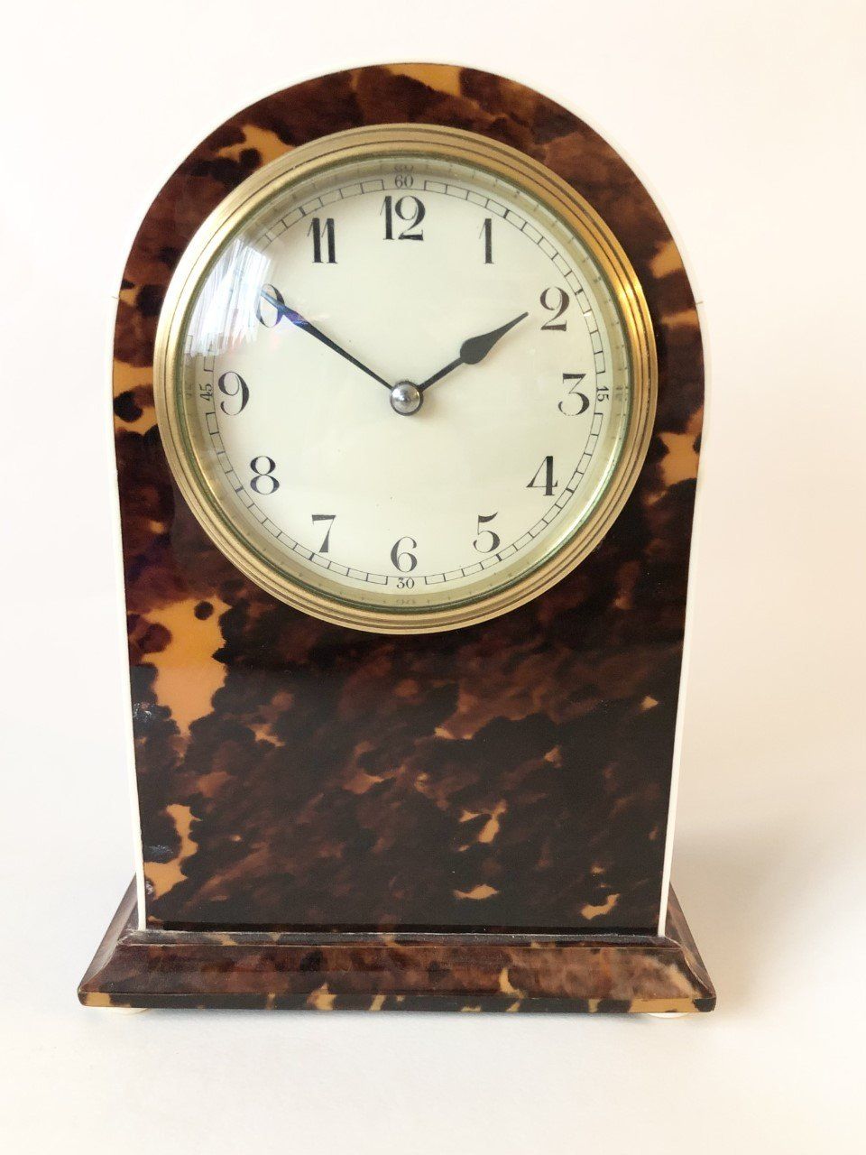 Very nice French mantle tortoiseshell domed top clock, with ivory stringing around front edge and with 4 ivory bun feet.